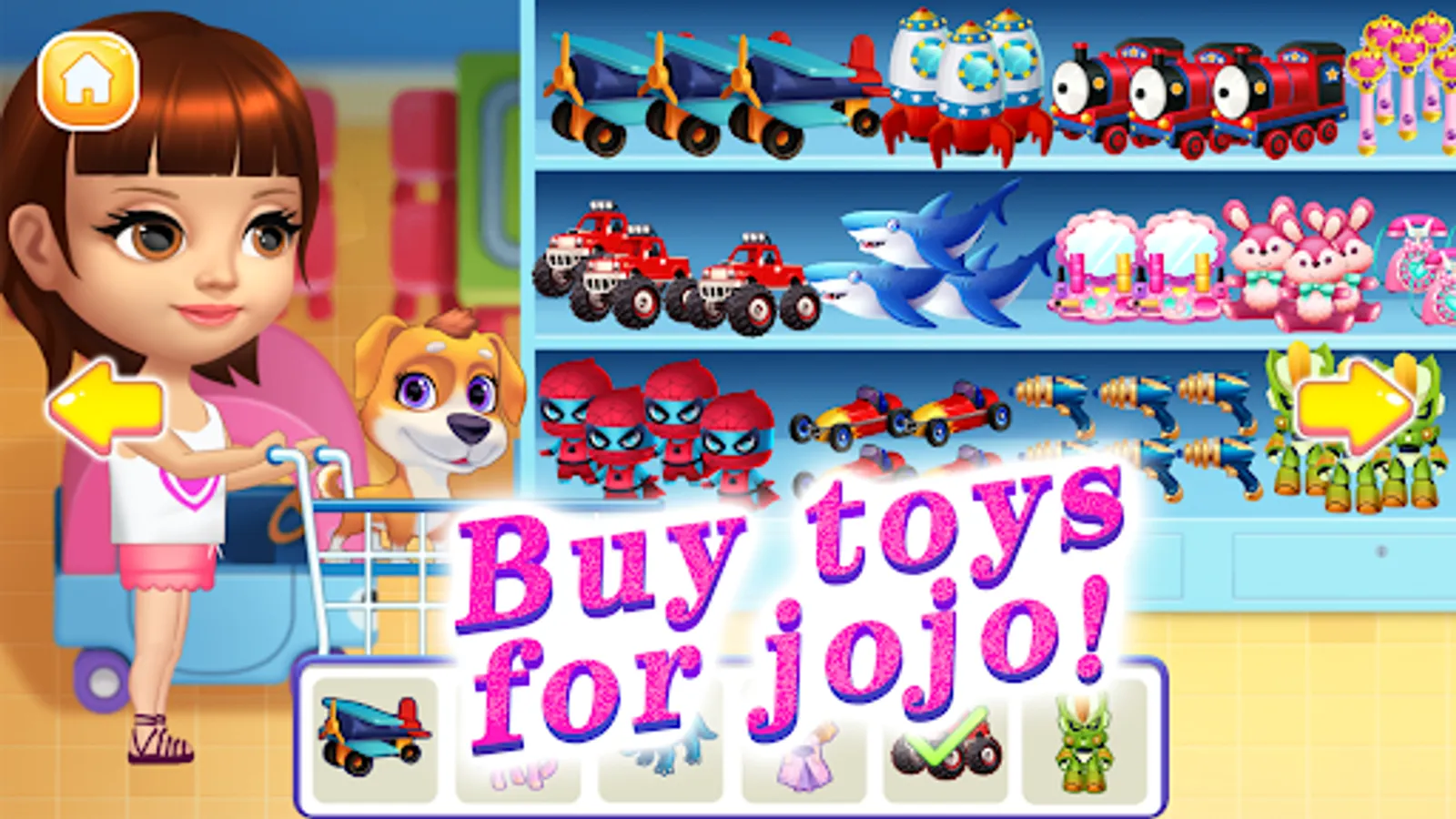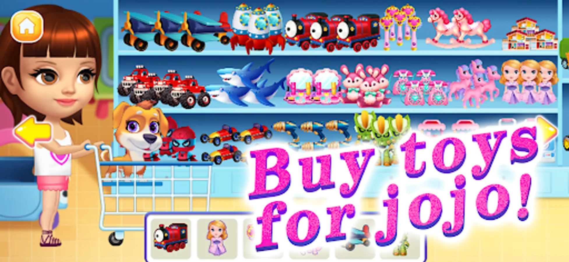 · Jojo wants to play with toys again. Go to the toyshop and pick interesting toys. The toy grabber on the side can also grab some!