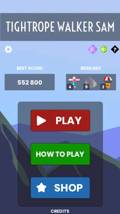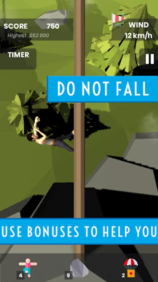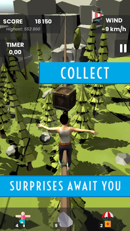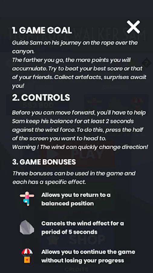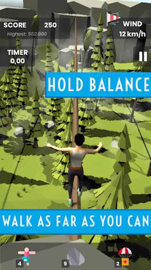 Help Sam the tightrope walker keep his balance while crossing the canyon to win the game. Your journey will be full of pitfalls, the wind blowing in the mountains will increase in intensity and change direction often testing your reflexes to avoid falling into the void.