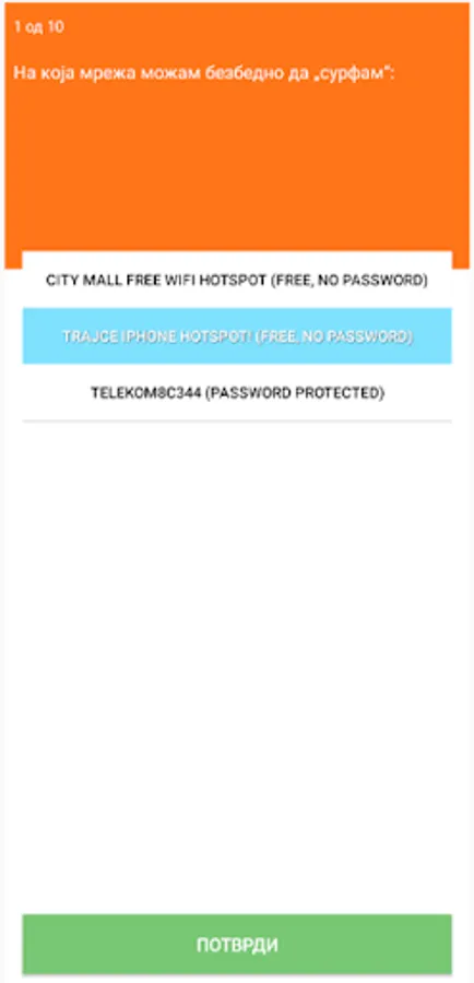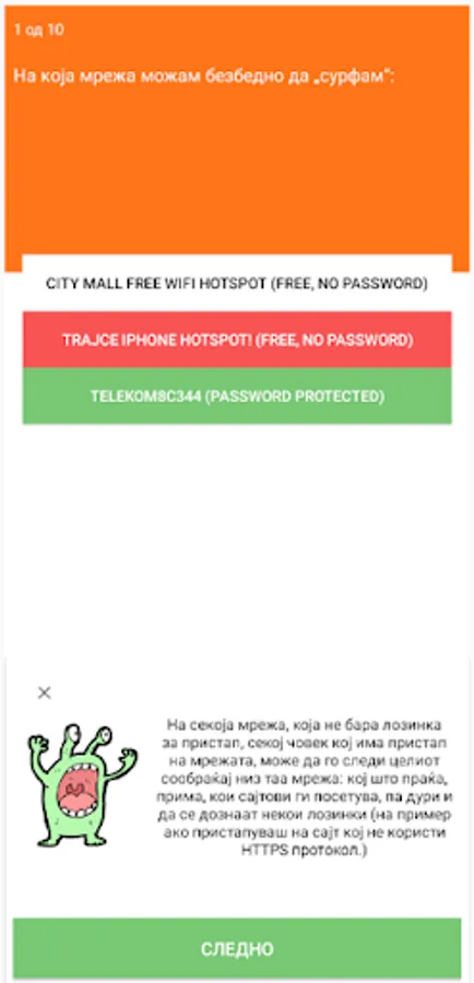In our educational game, the questions are designed according to the following topics: safe work on the Internet; protection of personal data privacy and copyright; creating positive digital footprints; recognizing the types of violence through the Internet; critical assessment of the reliability of the information; security when using social media and so on.