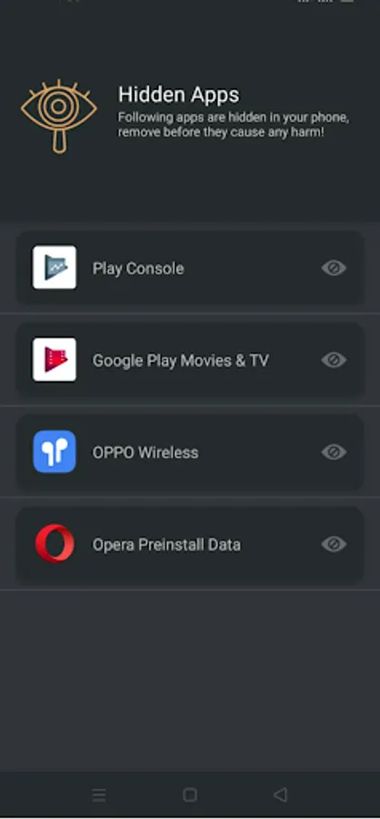 Displays important software, unknown programs, and third-party apps that install as batch files and instantly start spying on your SMS, gallery photos, call logs, contact list, etc.