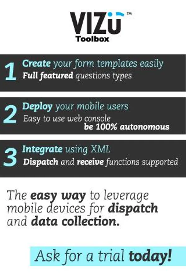 If you’re in an IT department and are empowering mobile workers receiving dispatched work orders or filling paper based forms VIZU Toolbox will change the way you equip your users. VIZU Toolbox requires an active account with sufficient mobile licenses to activate any new mobile devices, please contact us to open a new account.
