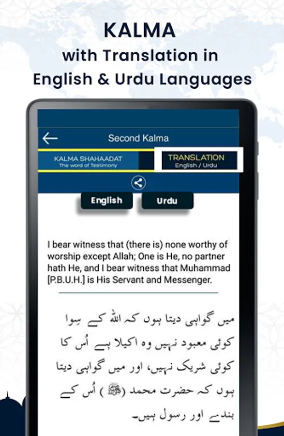 This particular application makes the process of learning these Islamic Kalmas by heart very easy and convenient. The App includes Six Kalimas in Arabic and English and Urdu translation and transliteration with interactive interface.