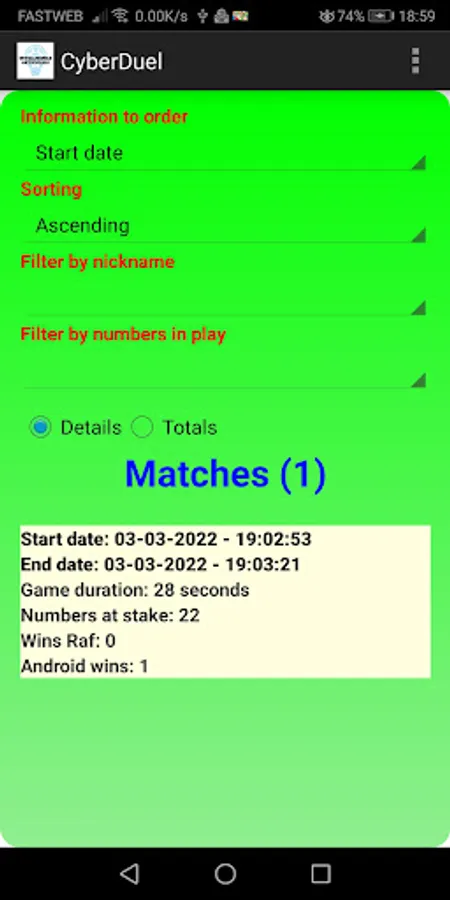 This information can be sorted in various ways (start date, end date, game duration, numbers in play, nickname,