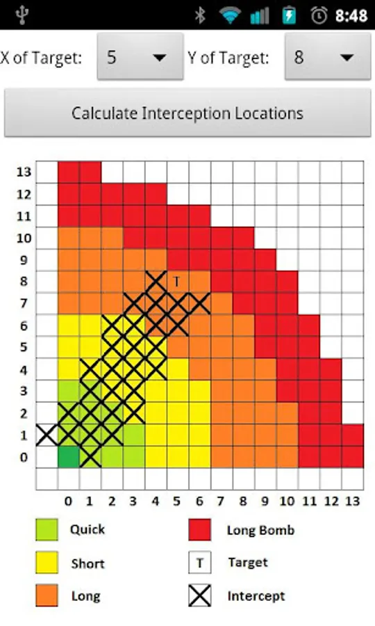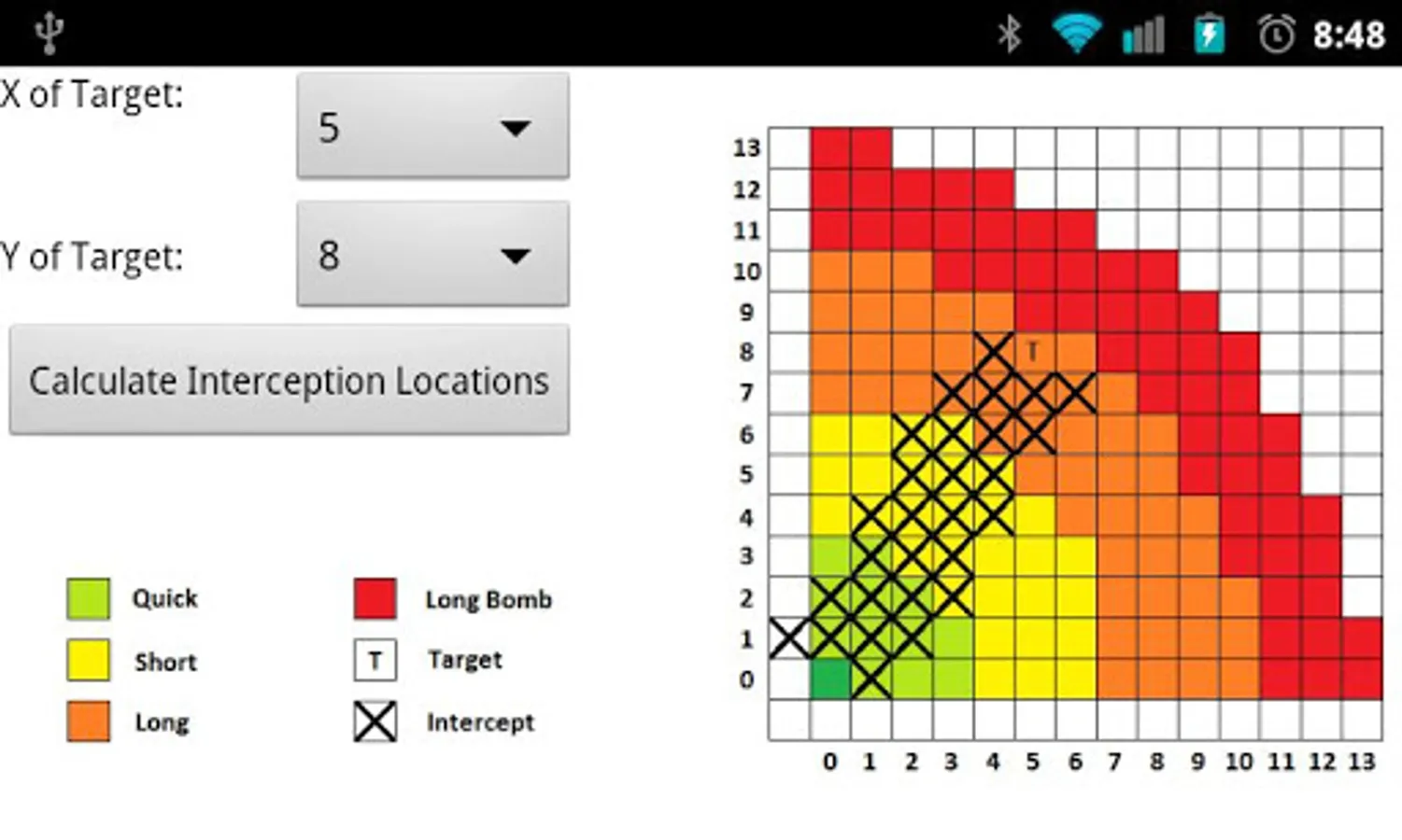 This app is now obsolete in two ways. The range of Long Pass now includes 13x2. It is possible to need to calculate interceptions beyond 13 squares. The scale did not change for later editions, so interception calculation is still accurate within the allowed range.