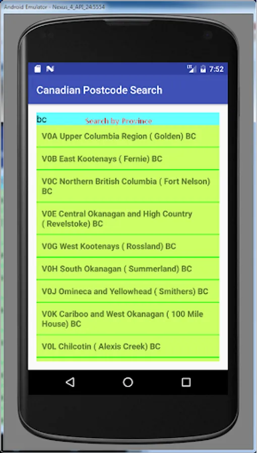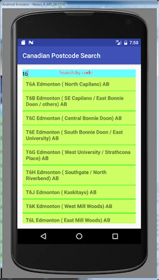 This app will allow you to find a postal code with in Canada. It is quick and fast. You can search by code or place name or province name. You can enter partial place name or code. Search results will be displayed as you type.