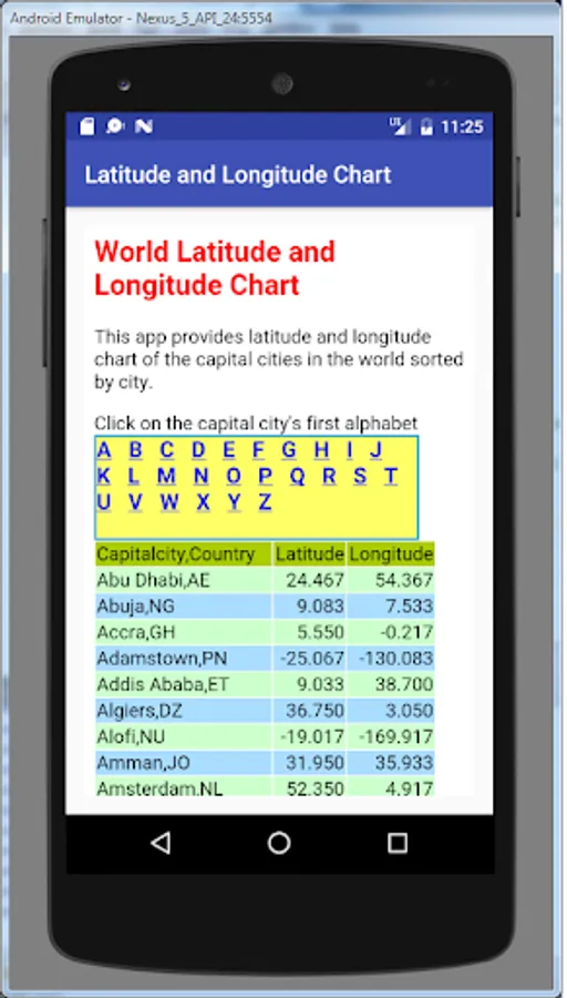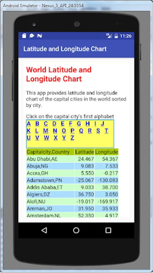 This app provides latitude and longitude chart of the capital cities in the world sorted by city.
