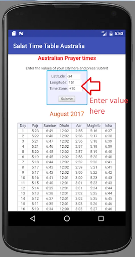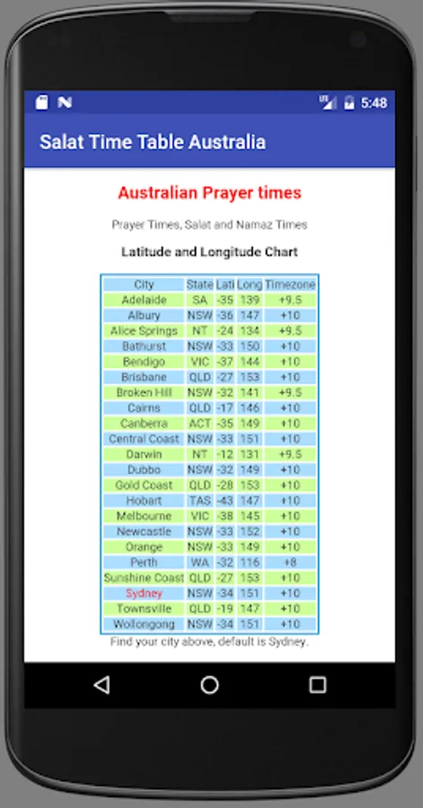 This app provides provides timetable of 5 times salat times in different part of Australia. You need to insert the latitude, longitude and time zone of the city you live in, the app will display time table for one complete month.By default Sydney was chosen. If you live in Sydney, you do not need to enter anything.