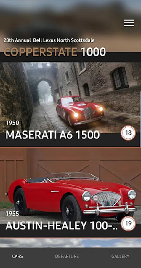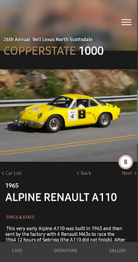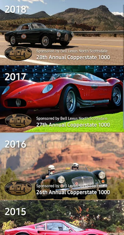 Copperstate 1000 fans of all ages, can get photos and descriptions on the 80+ rare, vintage cars on the 2016 Copperstate 1000 rally. Use it as your personal tour guide as you walk the Tempe Diablo Stadium for the send-off, or use it year round and search by car number or marque. A public itinerary is also available for the events at Tempe Diablo Stadium. After the rally is complete, fans get access to everything participants see. You'll get access to all route details for the 4-day, 1,000 journey. See where they stayed and which roads they took.
