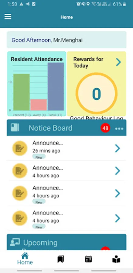 Application for staff to capture and view their own attendance, and receive announcements. Also, this application is used to capture the home resident's attendance, symptoms check, medical information and rewards.