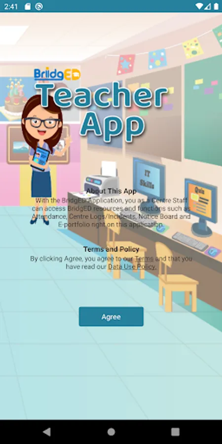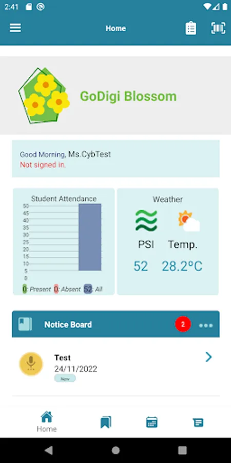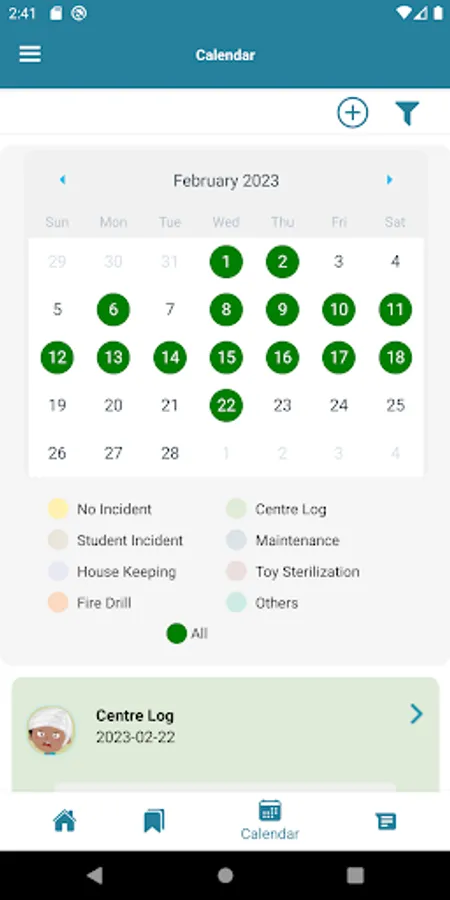 Functions for teachers to take attendance, apply for leave, enter center logs, upload files, and receive announcements.