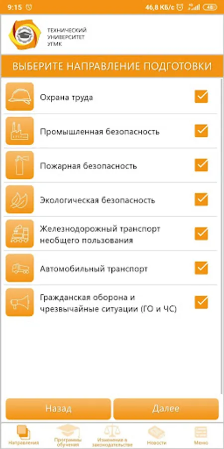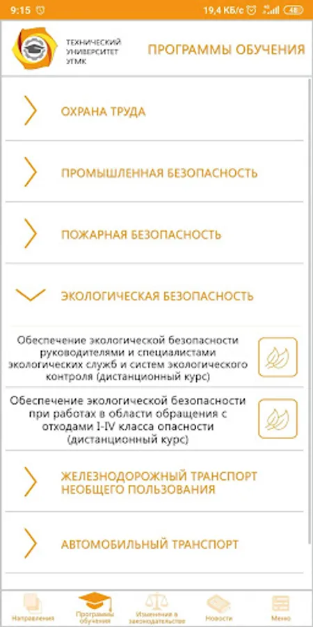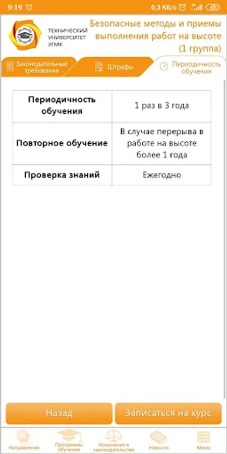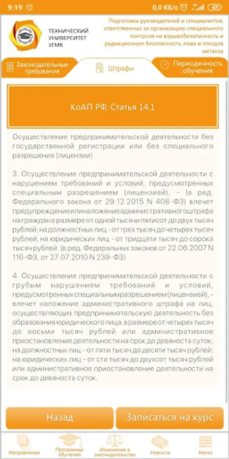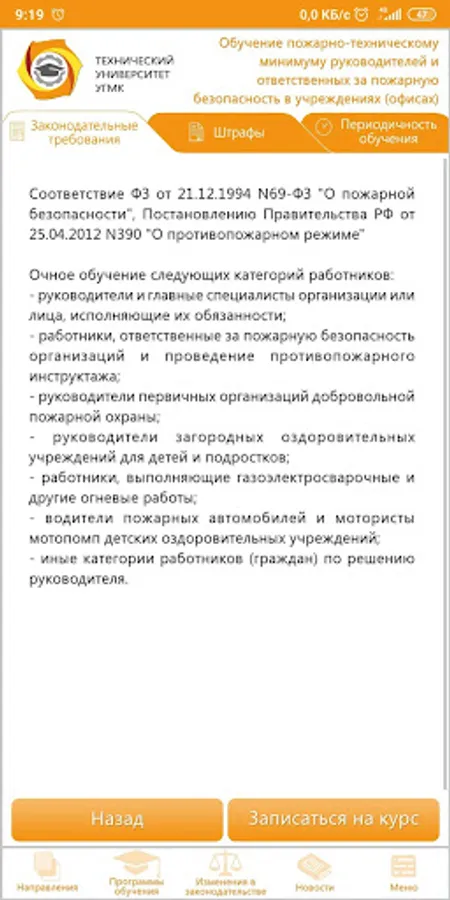 Using a mobile application, the user can select the security sections of interest and receive detailed information on them about legislative requirements, penalties, compulsory education programs, and the frequency of training.