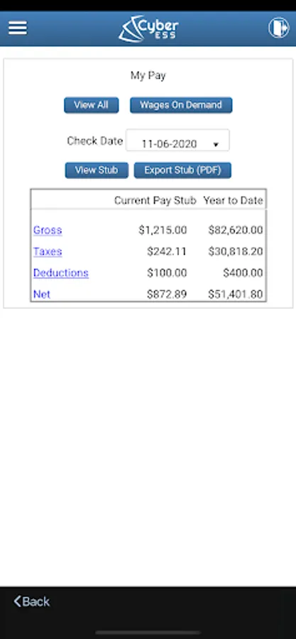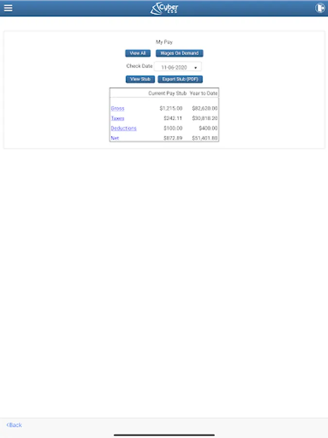 If your payroll is processed using software produced by CyberPay, Inc., such as CyberPay Online, then this app will allow you do download your pay stub and annual tax forms (W-2, 1099, etc.). This app will allow you to access the ess.cyberpayonline.com ESS portal. Additional services may be available, if offered by your employer.
