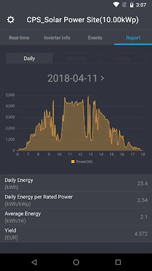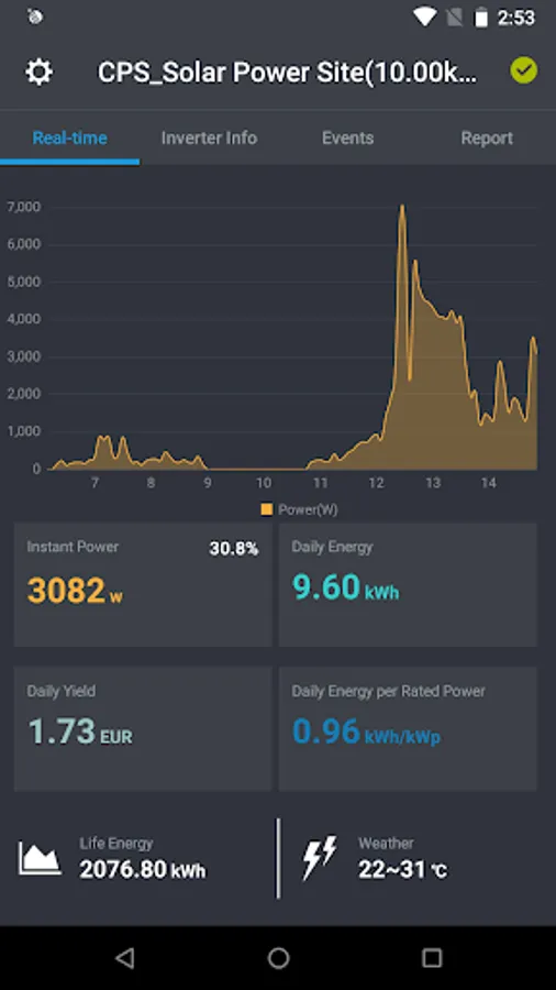 Real-time info provides at-a-glance view of the site’s overall information, including daily energy curve, instant power, daily energy, life energy, daily yield, daily energy per rated power, and weather information.