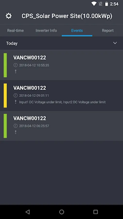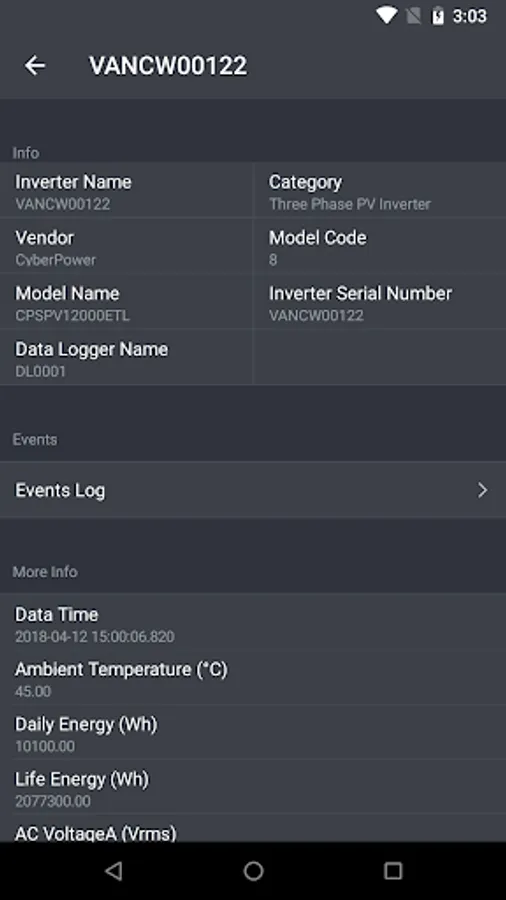 Events info provides the Inverter Status Log for you to track the events of all inverters.