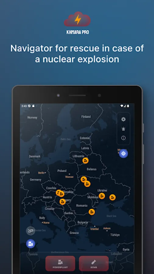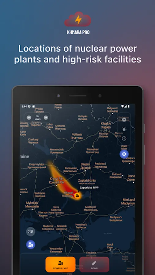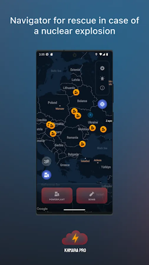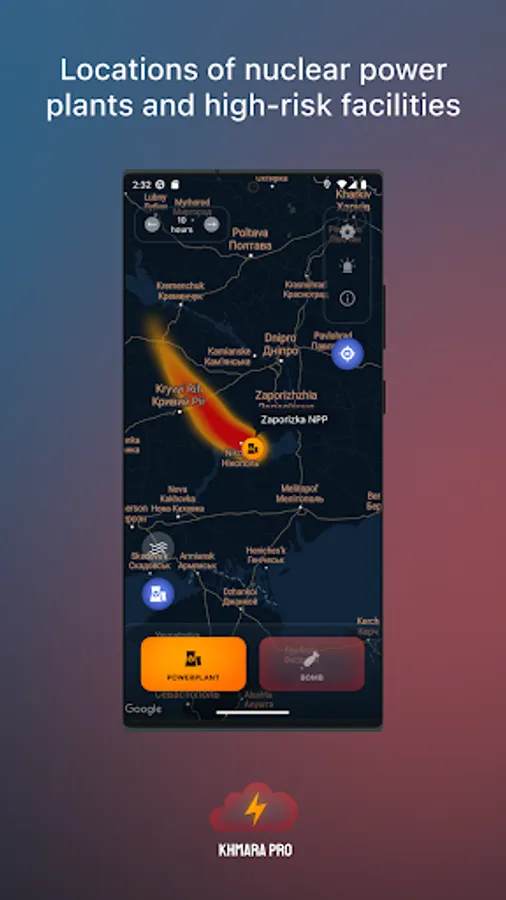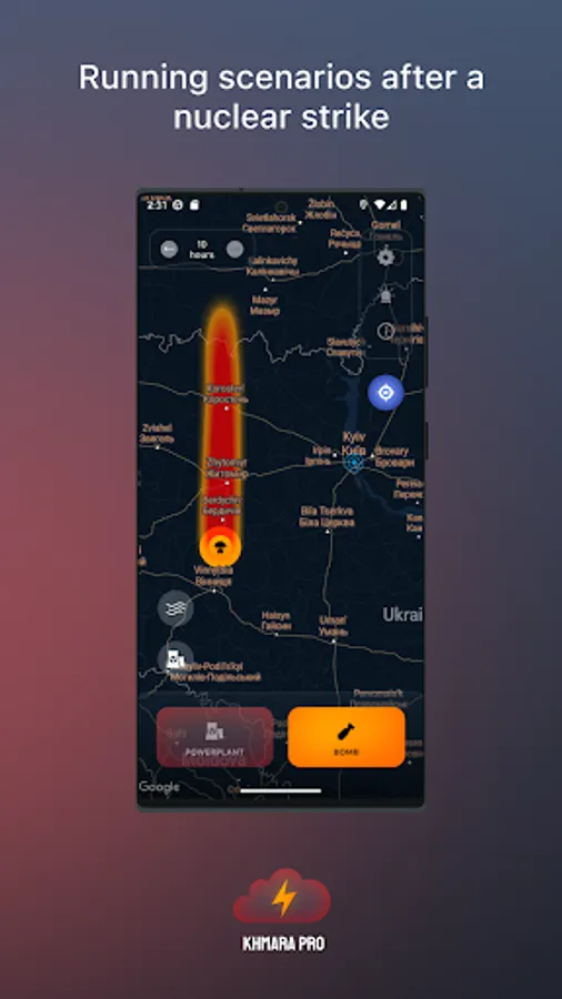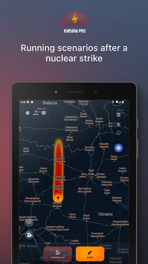 “Khmara PRO” Application was developed for informing the population in real time about the hazard that will occur in case of a possible nuclear accident. After a real explosion or radiation release, the affected area and wind direction will be displayed online and the application will alert all your loved ones about the danger. Users will be able to see on the map the location of the nearest Nuclear Power Plants and High-Risk Objects, as well as launch a nuclear strike scenario at any point on the map with the possibility to choose the impact force in the kilotons.