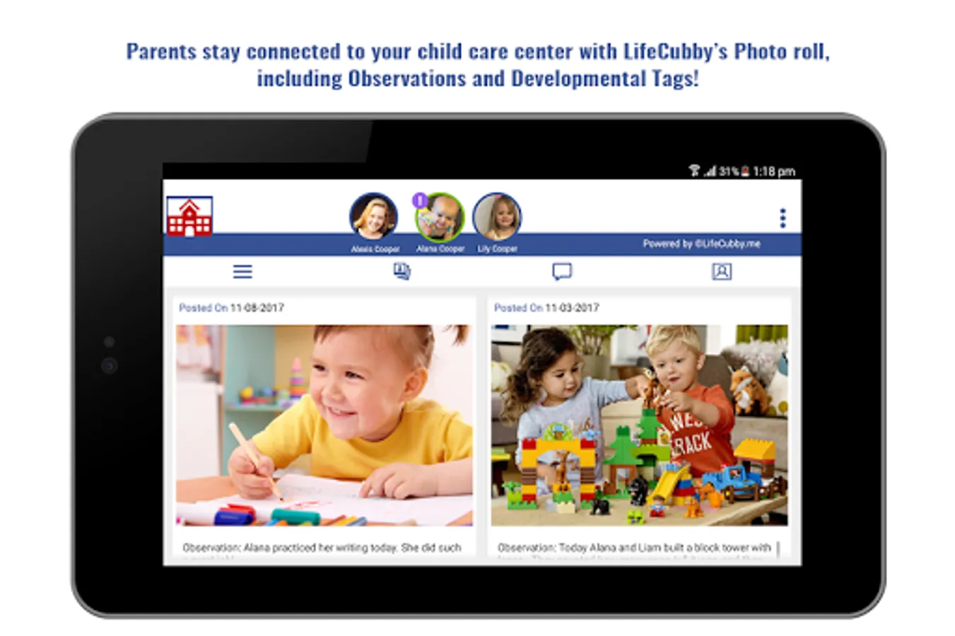 Since 2011, LifeCubby has provided real time communication solutions for child care centers and the parents that they serve. LifeCubby Family App is our offering for the parents, and is one of the most innovative solution. Parents use the LifeCubby Family App for quick access to their child’s information.