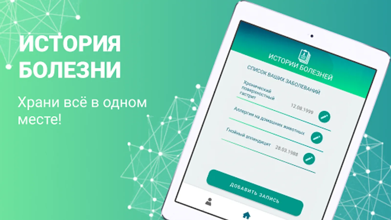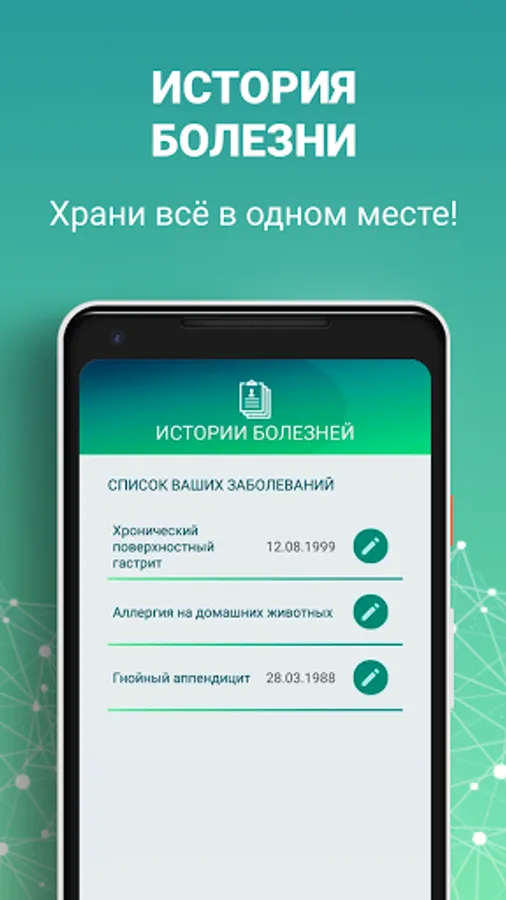 Section DISEASE HISTORY is designed to collect information about your health, hereditary and chronic diseases, previous operations, etc. Here you can enter your doctor's prescriptions and appointments.
