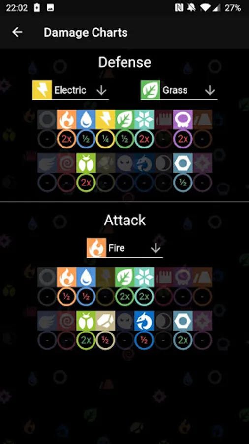 Damage charts - Easily generate damage charts for any type, either single or dual type, and for both attack and defense.