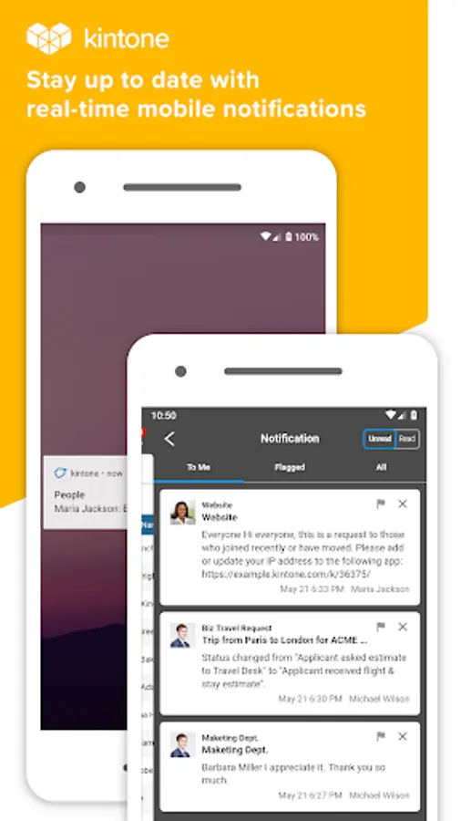 You also receive push notifications including "To Me" and updated information wherever you are, so that you neither miss the information you must confirm nor interfere with team's work.