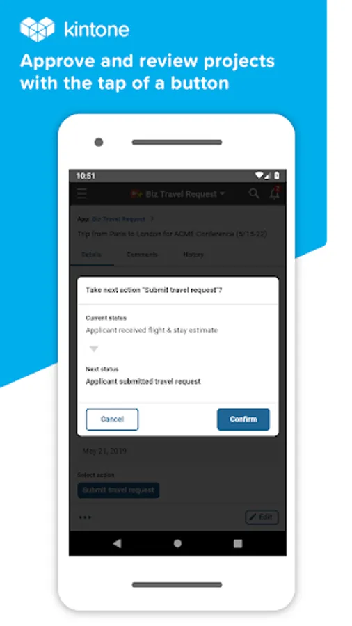 Kintone mobile helps you to work smoothly even outside the office, such as sending sales opportunity reports onsite and reporting statuses with photographs of stores and construction sites attached.