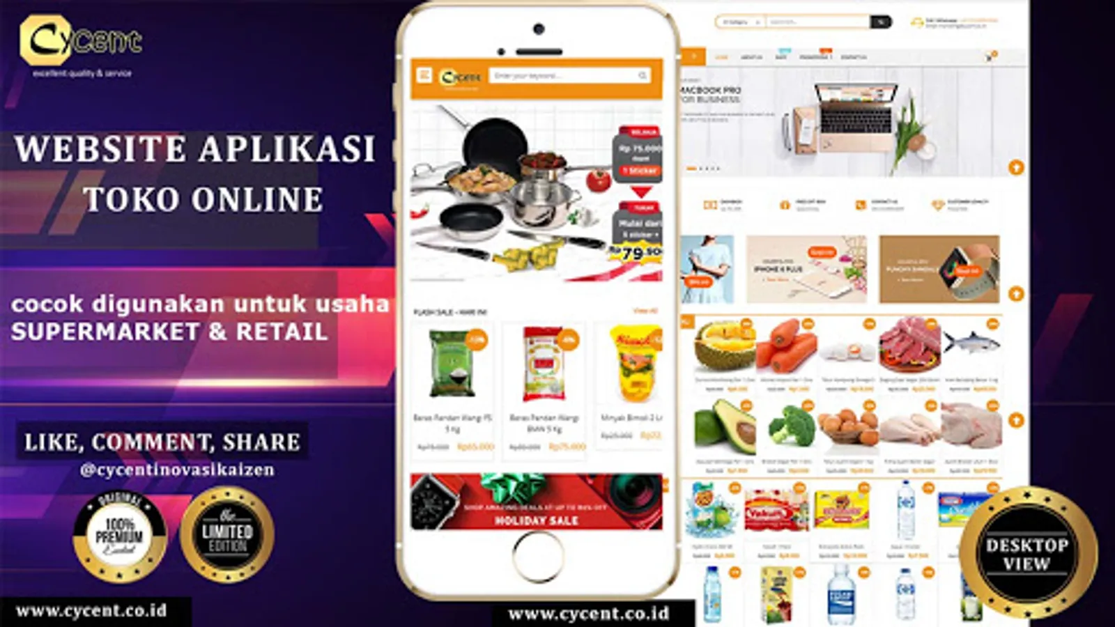 Perkenalkan Aplikasi Toko Online / E-Commerce dari PT. Cycent Inovasi Kaizen. Aplikasi ini dibuat untuk membantu para pemilik bisnis melakukan promosi produk dan branding usaha lebih luas lagi, menambah lini penjualan baru di online melalui Aplikasi Android & IOS sehingga menambah omset penjualan dan bisnis tetap berjalan meskipun ada pandemi.