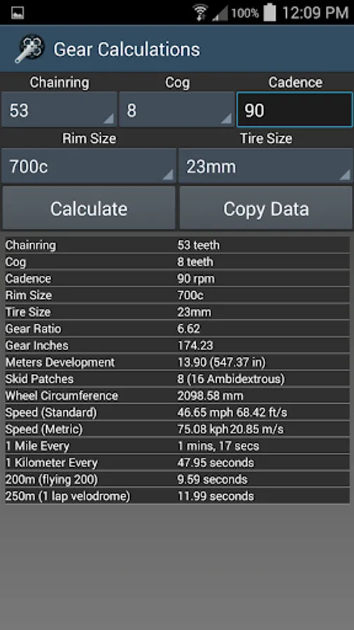 This is an essential app for an everyday bicyclist to a professional cyclist. This app has it all! Many calculations including Gear Ratio, Gear Inches, Meters of Development, Gear Speed and Skid Patch. There is also an all inclusive table that calculates all of the combinations of rim and tires to wheel and wheel circumference. Try different gear possibilities, or find out what cadence at a specific gear will produce the speed you want. Check out all the information possible on specific gear combinations. Also, compare different chainring/cog possibilities side by side by the innovative storing of the last 5 chainrings used. This app supports many chainring, cassette/cog, tire and rim sizes. This app can save you valuable time and money by trying different gear combinations to setup the bike how you want it. Newly added, estimations on speed and power. Estimate your speed based on a variety of configurable variables including power, weight, temperature, elevation, rolling resistance, wind, grade, frontal area drag and efficiency. Great for trying to estimate times for triathlons and races! Figure out what speed or power you will need for a specific distance. Even calculates calories and weight loss.