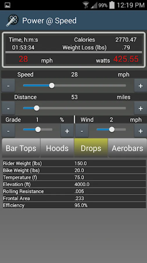 Newly added, estimations on speed and power. Estimate your speed based on a variety of configurable variables including power, weight, temperature, elevation, rolling resistance, wind, grade, frontal area drag and efficiency. Great for trying to estimate times for triathlons and races! Figure out what speed or power you will need for a specific distance. Even calculates calories and weight loss.