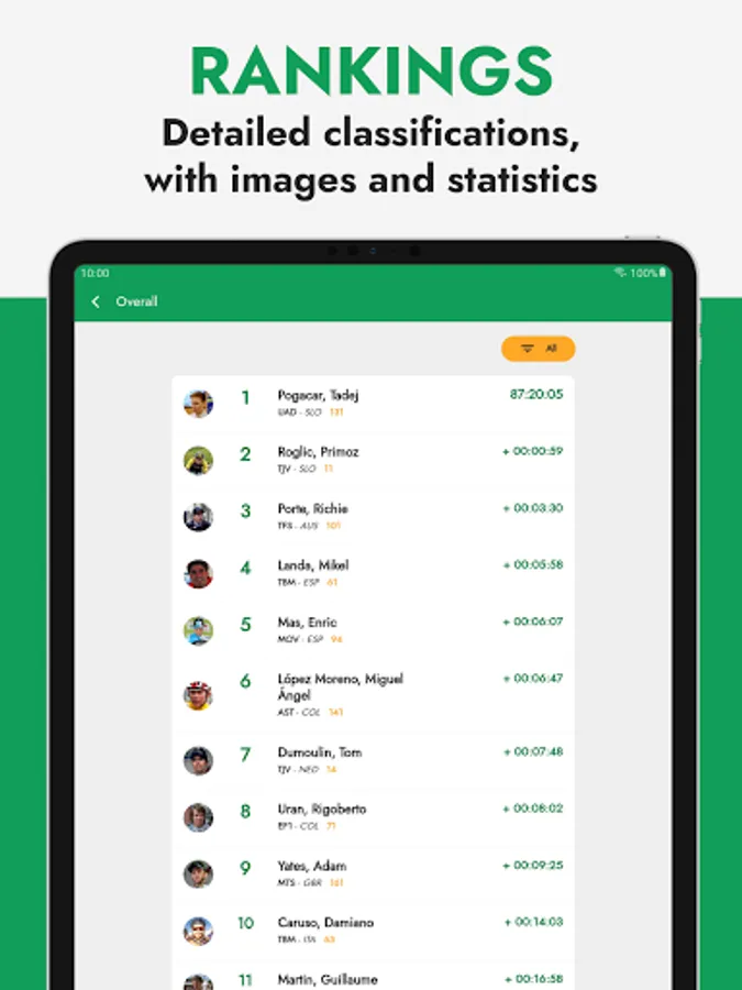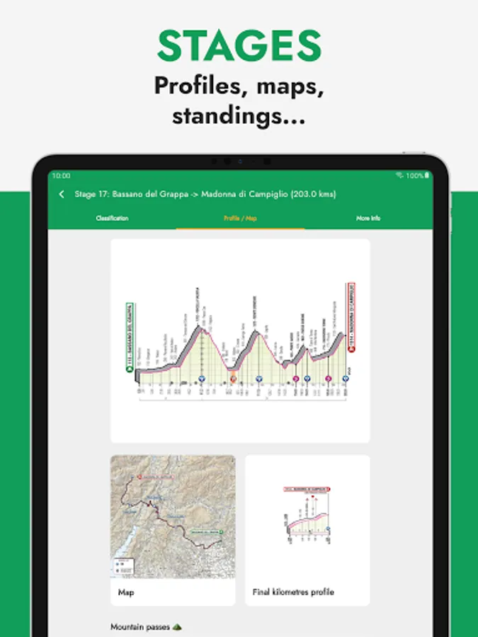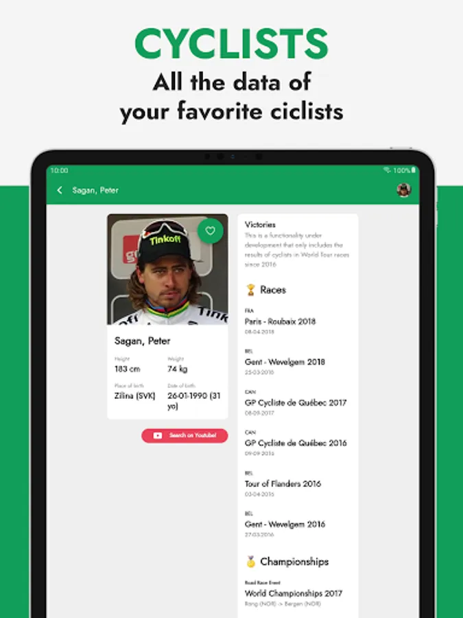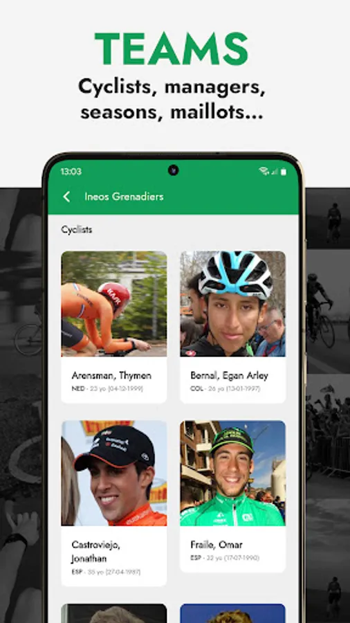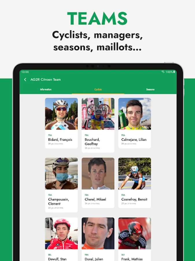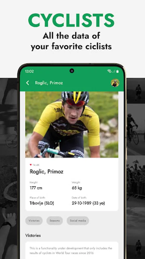 Cyclists have a detailed profile with images, personal data (height, weight, country, social network profiles...) and team seasons. Also every team has its own profile with the equipiers, jerseys, data, stats, all updated to the 23 season!🏆 Complete route and stage information!