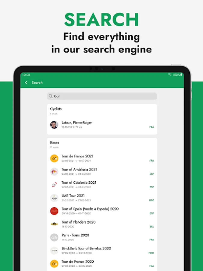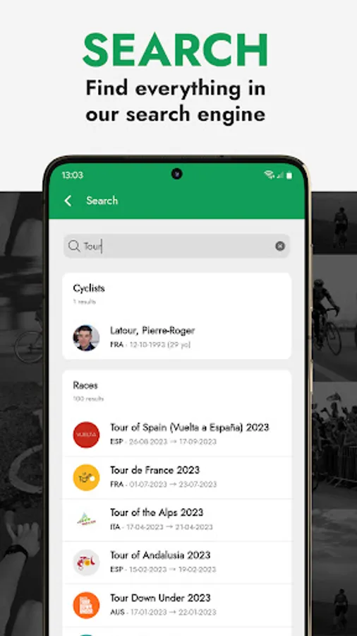 You will never miss a result, we will send you a push notification at the end of each race or stage with the winners! And it can always be deactivated from the settings.📆 Results of the entire cycling season!