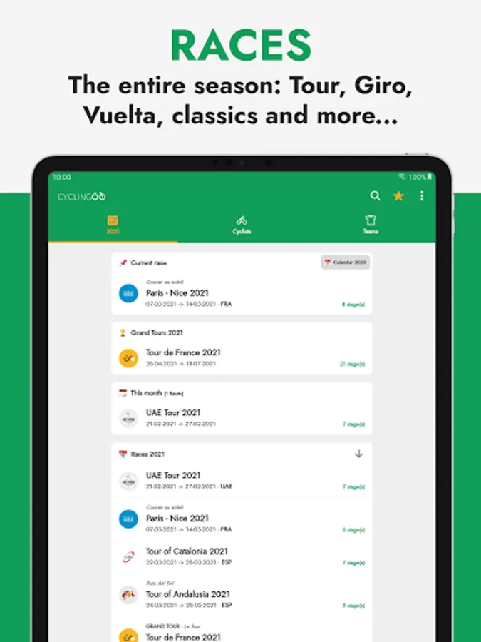 From the Grand Tours (Giro, Tour and Vuelta) to the main stage races: Tirreno - Adriatico, Paris Nice, Volta a Catalunya, Dauphine or the Tour de Suisse. Without forgetting, of course, the great cycling monuments: Paris - Roubaix, Tour of Flanders or the Milan San Remo among other spring and autumn classics. And as a novelty, the inclusion of female cycling.🗺️ Detailed profiles of teams and cyclists!