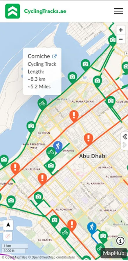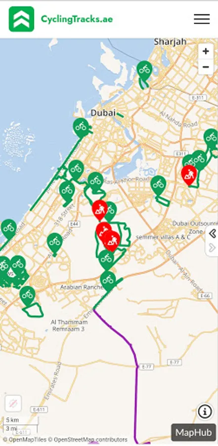 The UAE has invested heavily in cycling infrastructure, and it continues to do so. There is a growing network of beautiful and well-maintained cycling tracks and circuits all over the country, from the beach side circuit in Al Hudayriat to the tracks connecting the urban sprawl of Dubai, use our maps to find them all! we have growing maps of all cycling tracks in the UAE supplemented with embedded in-map pictures and information!
