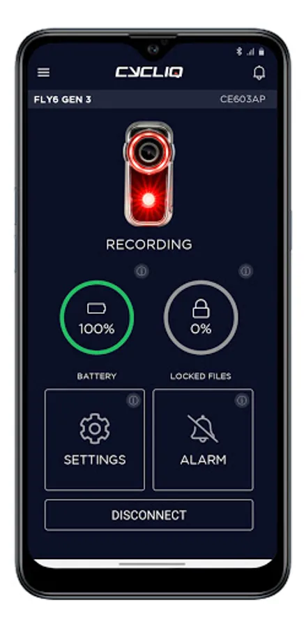 Cycliq bike cameras come with an integrated bike alarm. Enable and disable the alarm from the CycliqPlus app by toggling the Alarm button on the home screen. If your camera is moved when connected via the app an alarm will sound, the unit will start flashing and recording, and you’ll get a notification on your smartphone.
