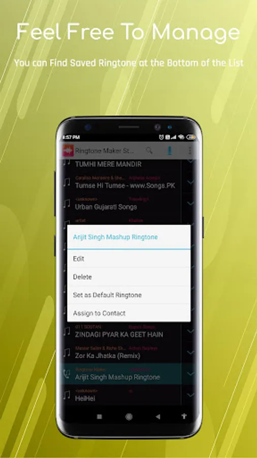 Free to manage your ringtone files. Edit, Delete and set as ringtone alarm notification tone.