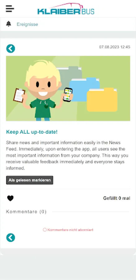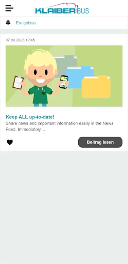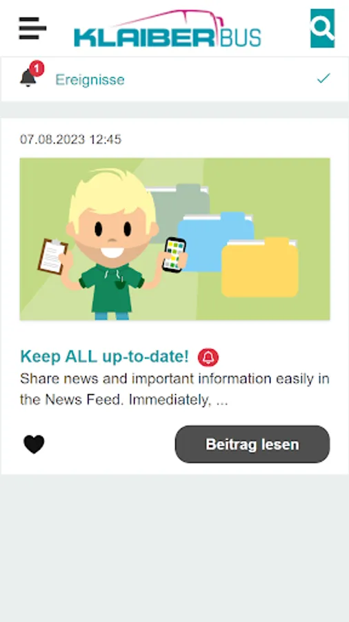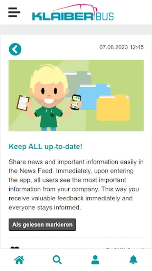 With the Klaiber Bus employee app, you are always informed about the attractive employee offers and about all important news from your company. Using an internal messenger, you have the option of chatting directly with your colleagues and posting personal experiences or ideas on the virtual pinboard. The app looks similar to a familiar social media environment and is therefore extremely easy to use.