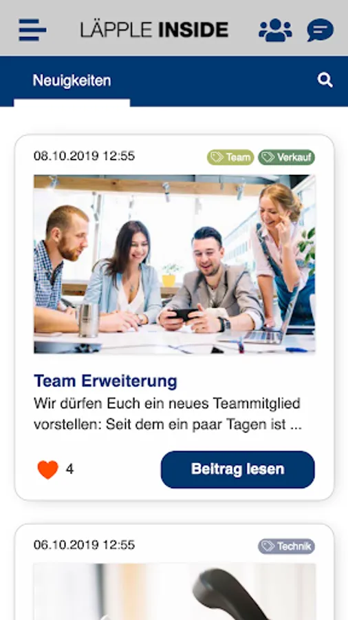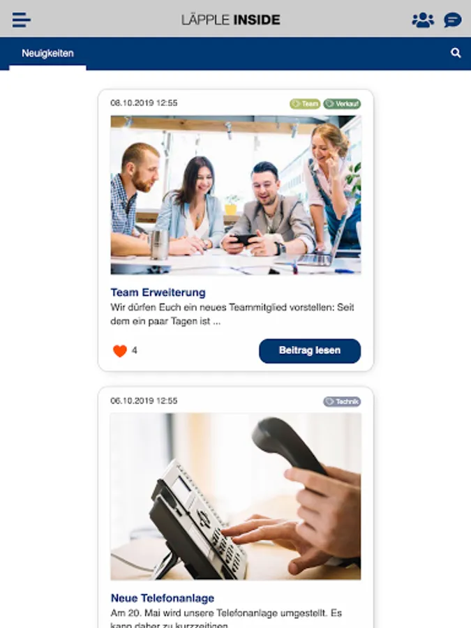 LÄPPLE INSIDE is an app exclusively for employees from companies in the LÄPPLE Group. LÄPPLE INSIDE offers, among other things, current company news, interesting information for daily work and the possibility of communicating directly with colleagues personally or within self-created groups via the chat function.