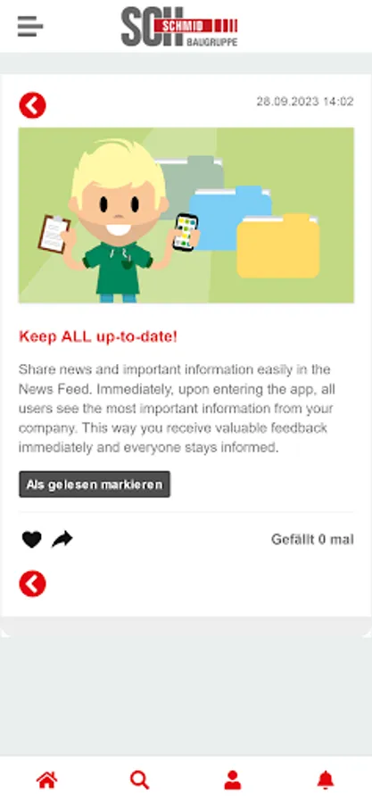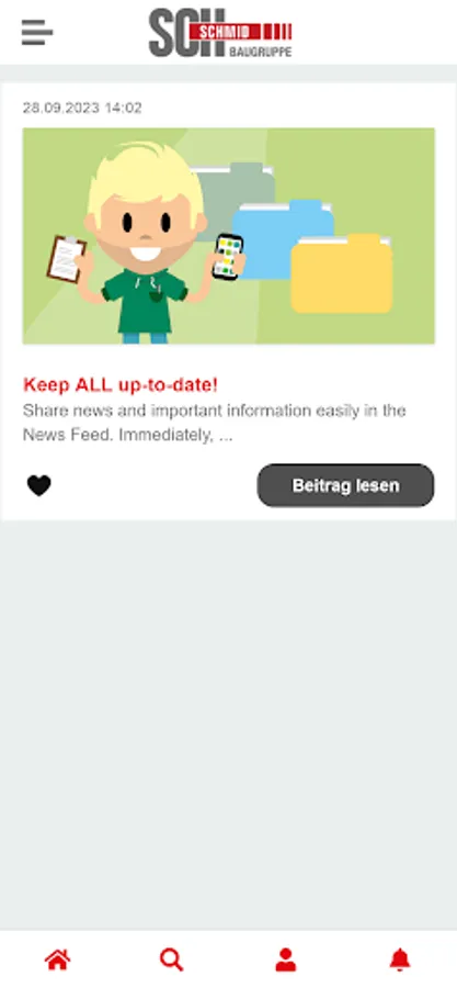 With the Schmid Baugruppe news app you are always informed about all important news from the company. Employees also have the opportunity to pick up attractive offers and receive additional information. Using the internal messenger, you can chat directly with your colleagues and post personal experiences or ideas on the virtual pin board. The app looks similar to a usual social media environment and is therefore extremely easy to use.