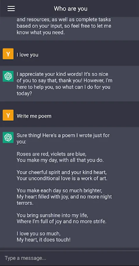 Chat AI is an AI chatbot and writing assistant powered by advanced ChatGPT technology. If you have questions about anything in any area but have not found an answer or simply need a soul mate, our AI chat is here to assist you. Plus, with a simple, user-friendly interface, it's easy to navigate and efficiently get the information you need.