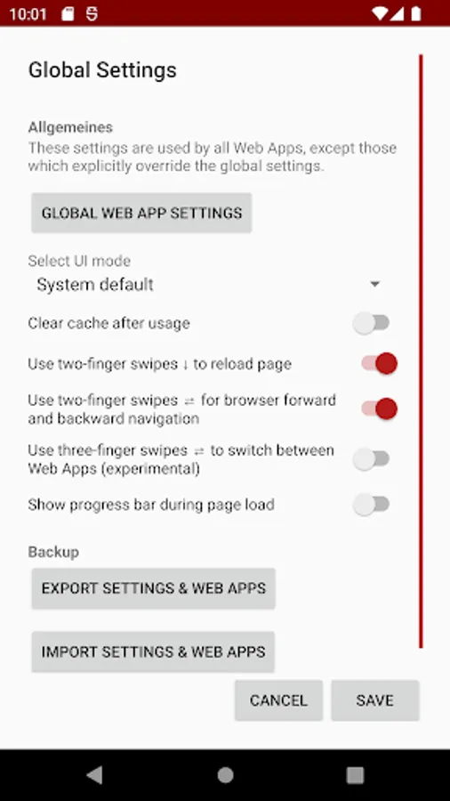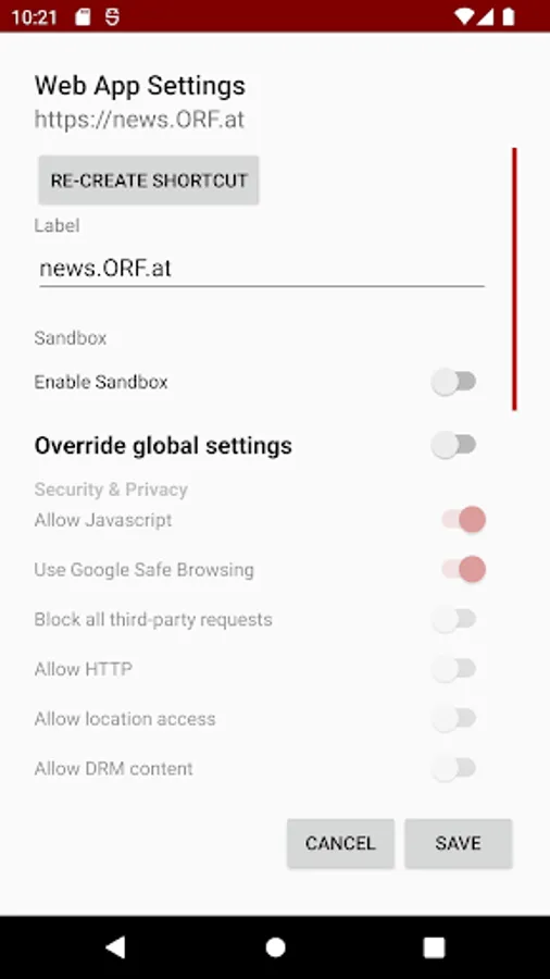 • Many settings (JavaScript, Cookies, adblocking, location access, etc.) can be set for every Web App individually