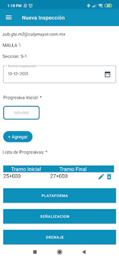 App that allows you to enter the information of the inspections of Route 9 Santa Cruz-Trinidad, the data stored on the mobile device and will be synchronized with a database.