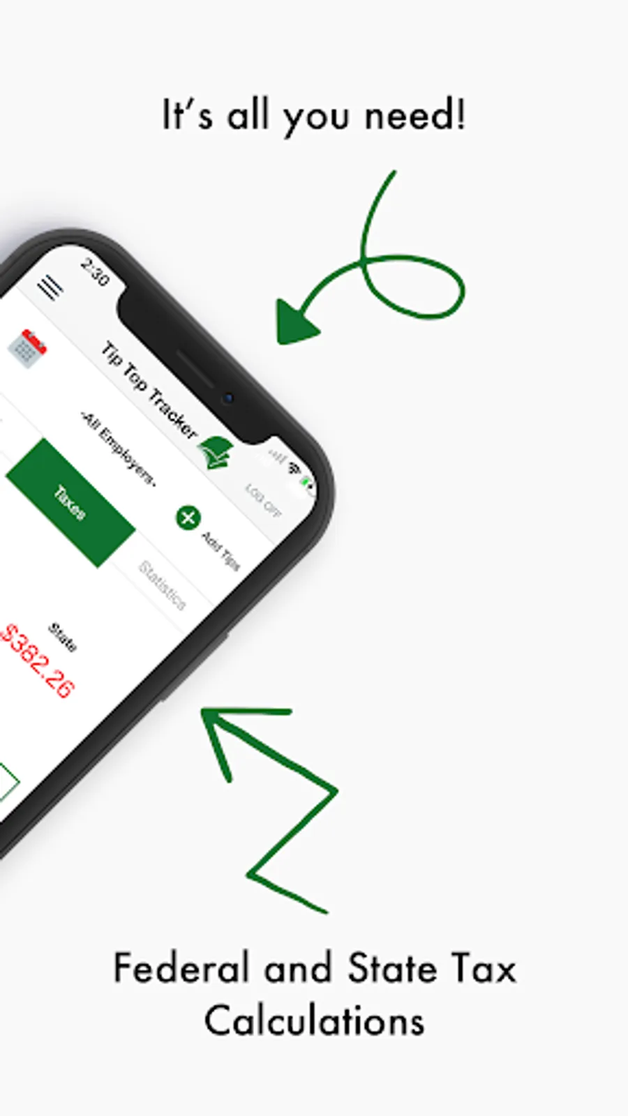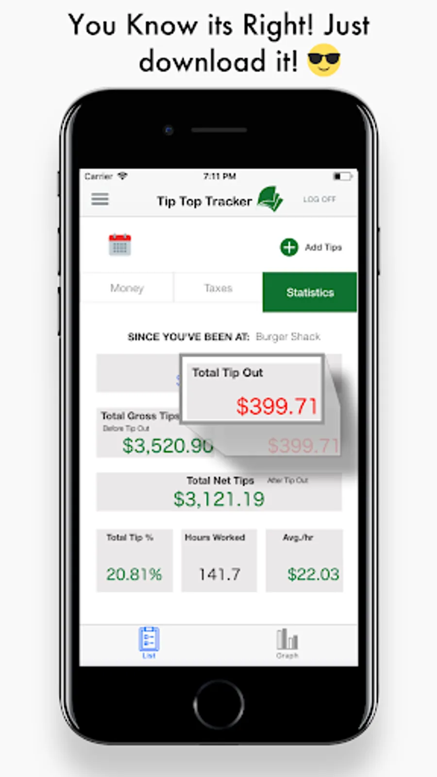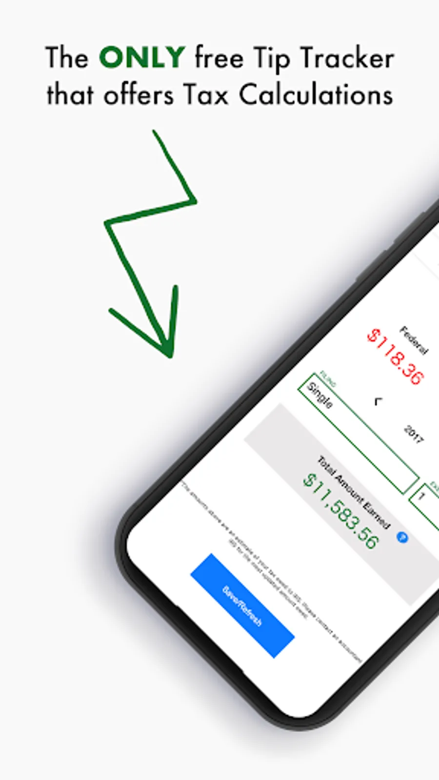 Tip Top Tracker is the best free and smart tip tracker that will keep tracking your Tips and will let you know the amount of money that you made as well as the amount of taxes you owe, right on your Mobile phone.