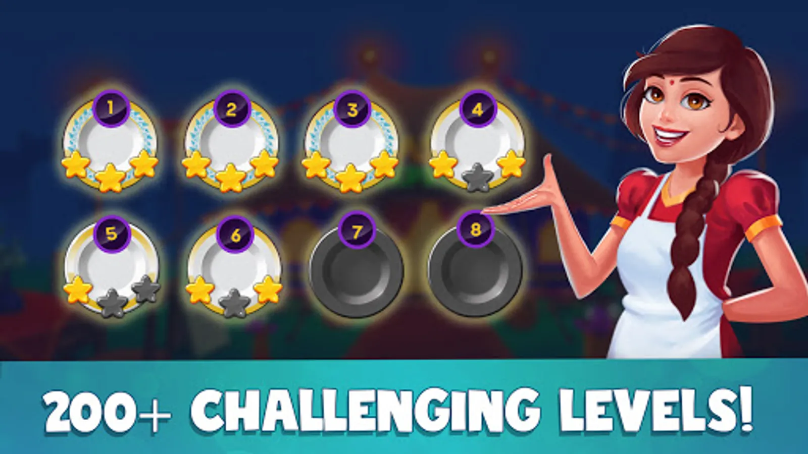 * Play hundreds of levels and cook & serve cuisines like Northern Delight, Southern Delight, Coastal Delight, and Indochina Delight along with many other food items to serve.
