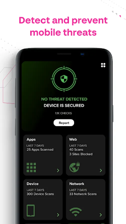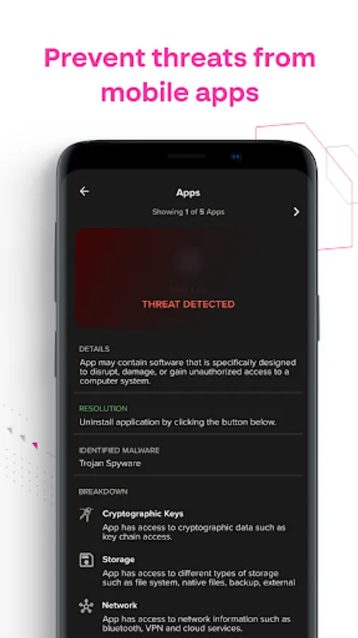 Cynet 360 Mobile evaluates the risks posed by mobile apps downloaded to the device, and protects against threats such as phishing, untrusted networks, and device-level attacks. The application detects: