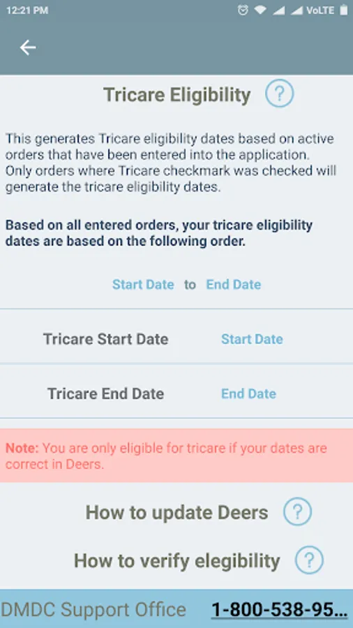 Never lose sight of when your Tricare benefits start and end! By entering the order issue date and selecting the qualification tag the application will present you with the exact start and end date of your pre and post mobilization coverage.