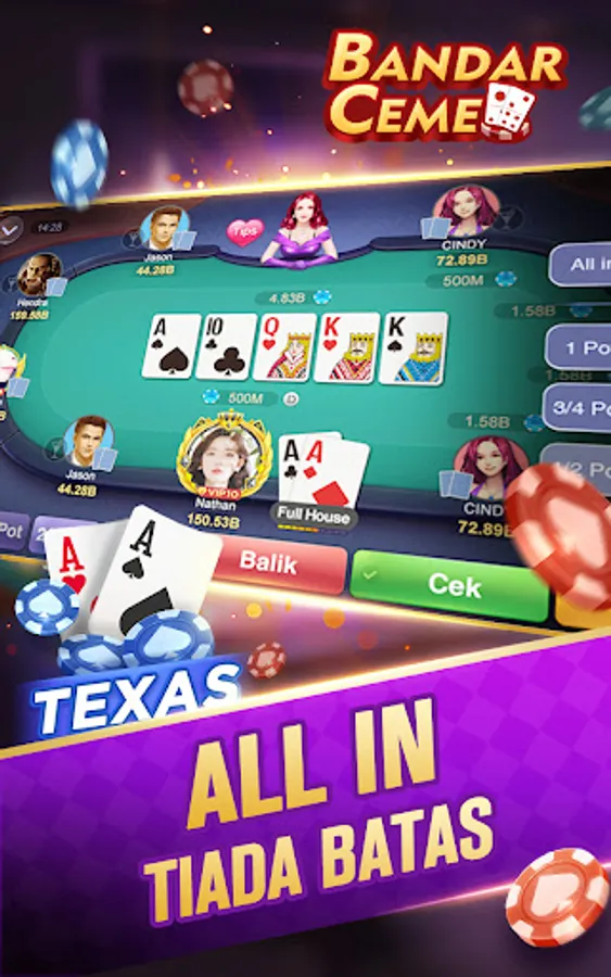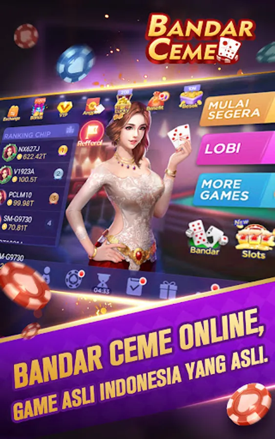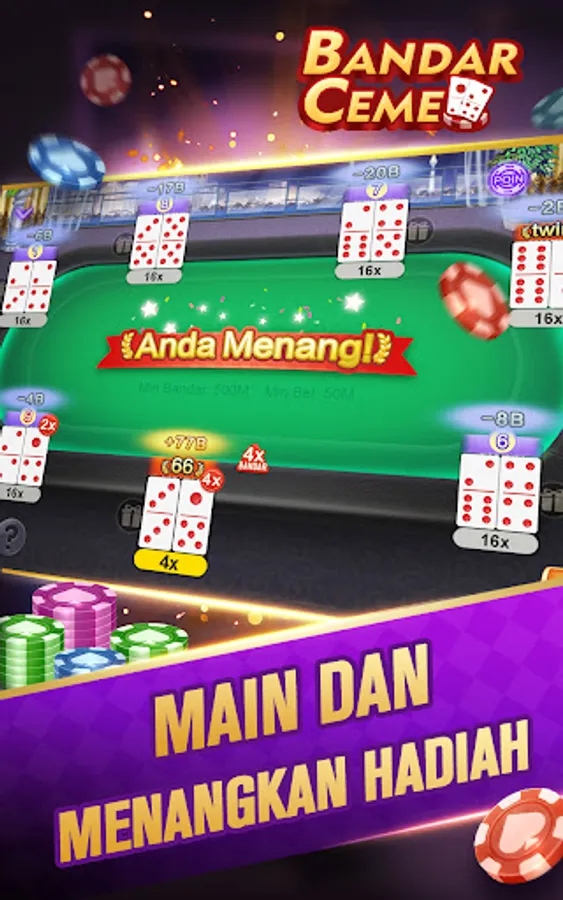 Bandar ceme is also called:bandar Qiu,domino qiu,adu qiu,bandar 9. This game is rich in gameplay and contains:Domino QiuQiu99kiukiu,Texas,sicbo,korok dice,dice,baccarat,slots.