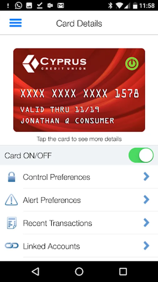 Card Control from Cyprus Credit Union puts you in charge of your cards. Card Control allows you to turn your Cyprus Debit or Credit cards off and on with a simple swipe and get real time notifications anytime your card is used. You choose the locations, amounts, merchants, and transaction types allowed on your Cyprus Credit or Debit card. Plus, with location controls you can limit transactions to your current location or regions that you choose. Card Control from Cyprus Credit Union - take charge of your card today!