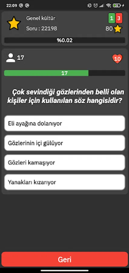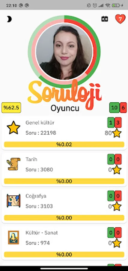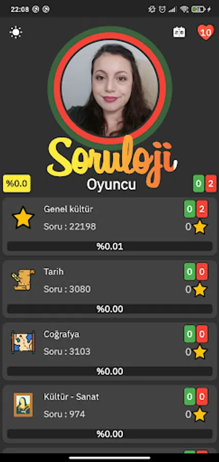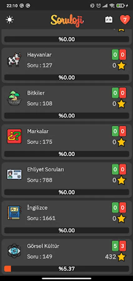 Questionology is a quiz game and its categories include general culture, history, geography, art and culture, sports, literature, music, cinema, politics, children, flags, celebrities, football players, cars, movie characters, team crests, animals, cities, plants, brands, make-up tools, kitchen utensils, driver's license questions, English and visual culture.