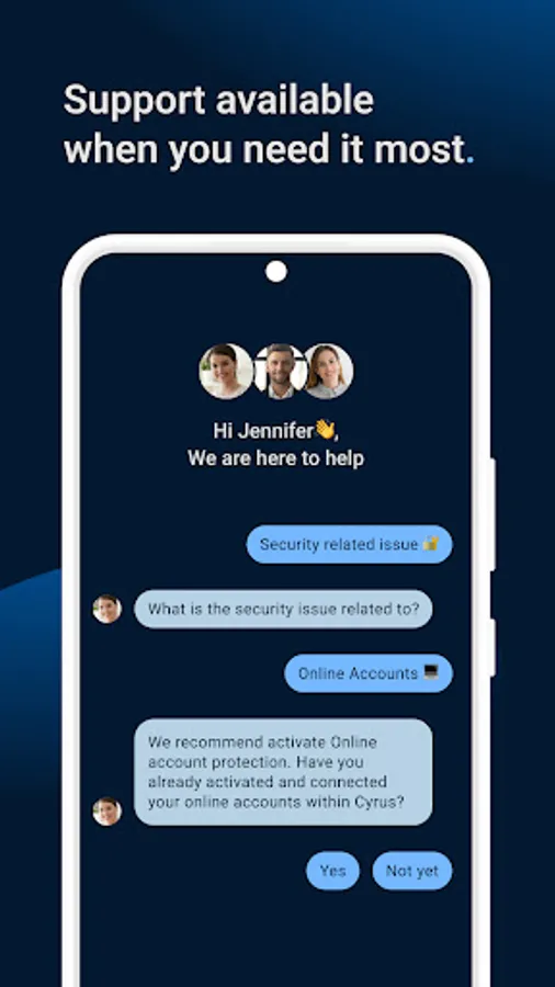> Human chat support by cybersecurity experts who are available 24/7 to answer any questions you may have.