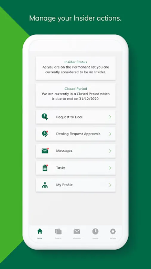 Use Insidertrack to access your Insider and Confidential project lists, wherever you go. View others on those lists, so you know who has access to project information in real time. Access and acknowledge your responsibilities as a project list member and request permission to undertake share transactions.