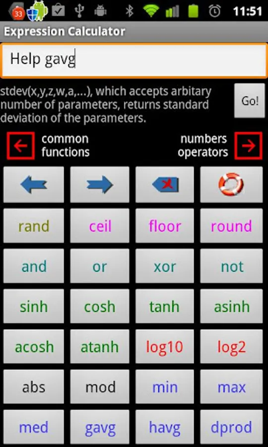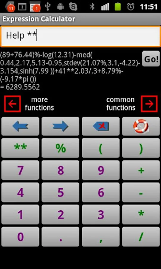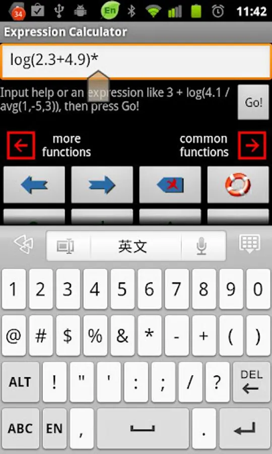 User is able to input an expression using keyboard or function buttons, or copy a historical record from history screen or by clicking the output box. An expression is made up of operands, operators, functions and parameters. An operand or a parameter may not be a number, it can be an expression. Blank characters between expression elements, i.e. operands, operators, functions and parameters, do not affect calculation result. Capitalized and uncapitalized characters are both supported. An example of expression is pow(4.01,3.1) *0.0731 + sin(toRAD(sum(17, 21, avg(3.71, log(198.2), -9.99,112.7),abs(-11.2))))/(2!) .