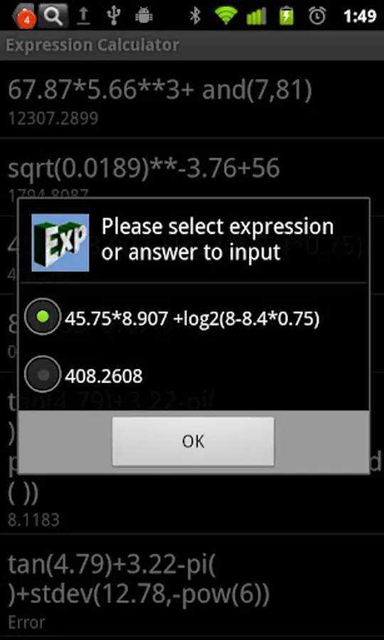 The history screen shows user the recent calculation history. By clicking one of the records, user is able to place either expression or result into input box, which saves typing time. Note that if result includes error, expression will be put into input by default.